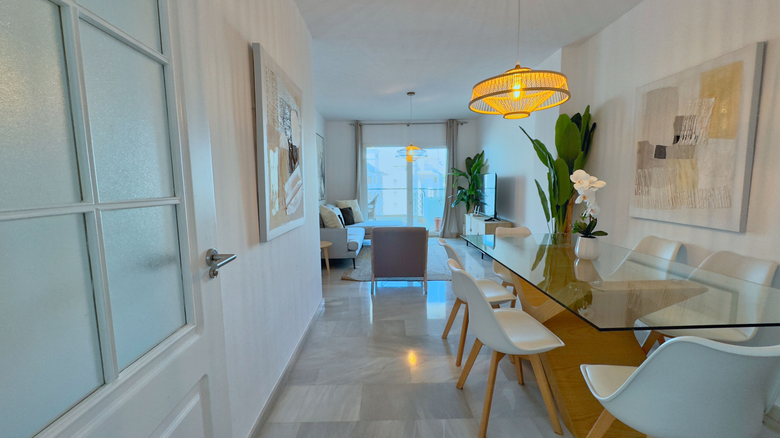 La gran terraza acristalada, perfecta para su uso durante todo el año, ofrece vistas parciales al mar y a los jardines de la urbanización. Ideal para desayunos al aire libre, cenas al atardecer o simplemente relajarse bajo el sol.